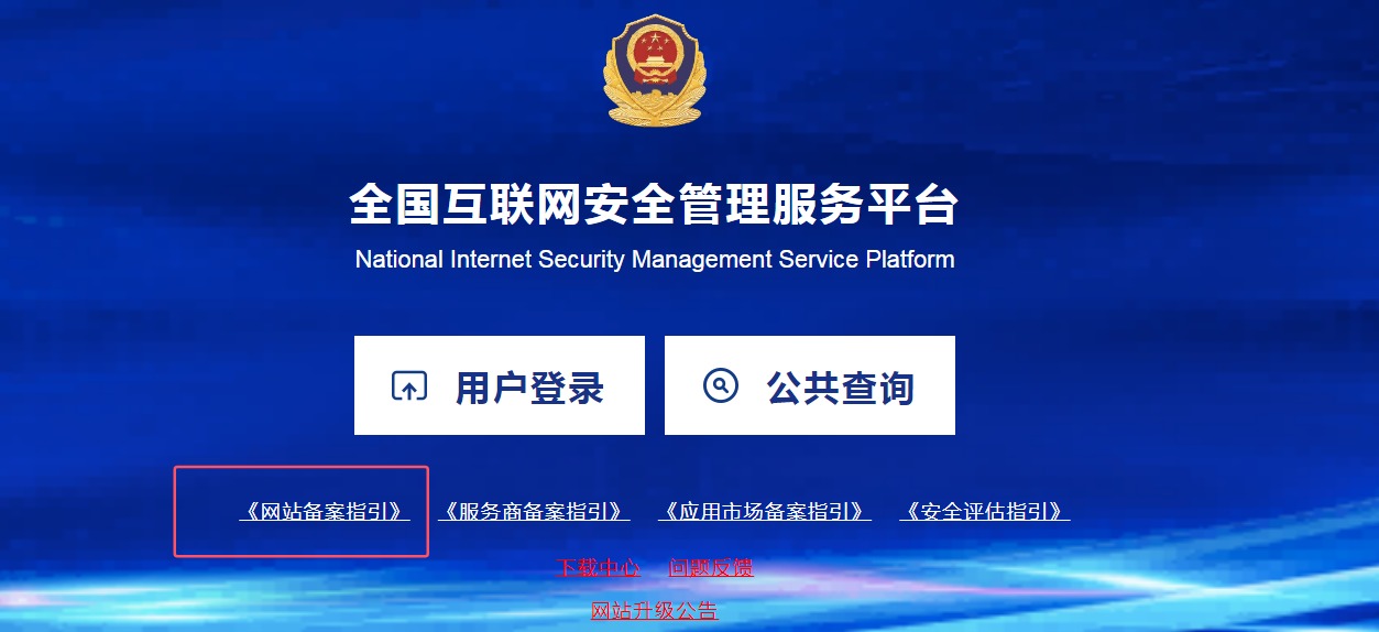 1、打开“全国互联网安全管理服务平台”网站链接:https://beian.mps.gov.cn/,点击下载文档“《网站备案指引》”,如下图所示: